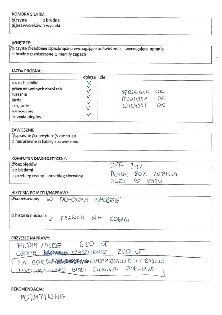 W nagłówku umieszczam podstawowe dane pojazdu. Dalej pomiary grubości powłoki lakierniczej, pomiar szerokości szczelin. Po prawej na pierwszej strony zanotowałem wypadkowość pojazdu, stan klimatyzacji, klocków, tarcz, opon i szyb. Na drugiej stronie umieszczam opis silnika, wnętrza, obserwacje z jazdy próbnej, stan zawieszenia oraz odczyty z komputera.